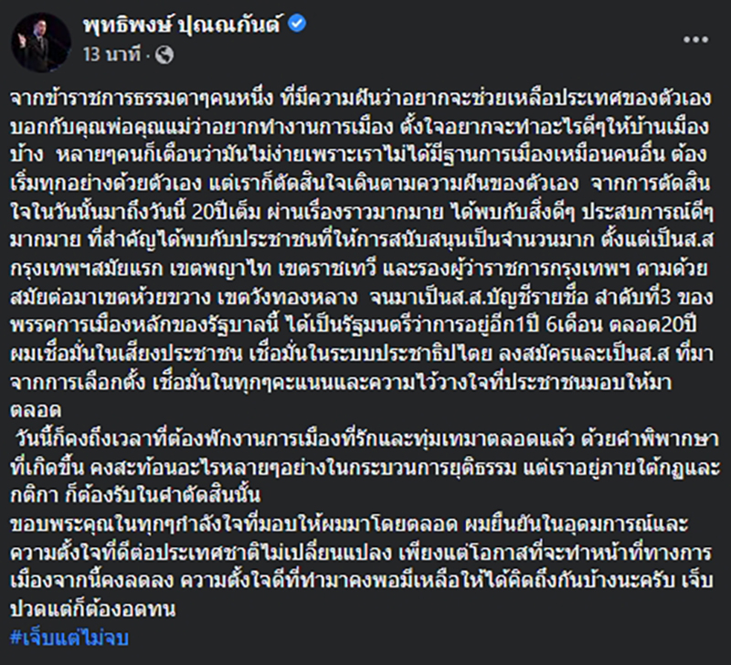 "ขอบพระคุณในทุกๆกำลังใจที่มอบให้มาโดยตลอด ผมยืนยันในอุดมการณ์และความตั้งใจที่ดีต่อประเทศชาติไม่เปลี่ยนแปลง เพียงแต่โอกาสที่จะทำหน้าที่ทางการเมืองจากนี้คงลดลง ความตั้งใจดีที่ทำมาคงพอมีเหลือให้ได้คิดถึงกันบ้างนะครับ เจ็บปวดแต่ก็ต้องอดทน #เจ็บแต่ไม่จบ" นายพุทธิพงษ์ กล่าว