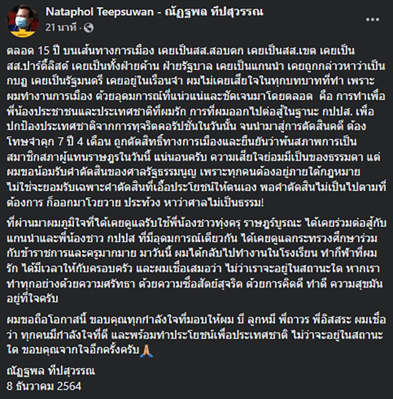 ส่วน นายณัฏฐพล ทีปสุวรรณ โพสต์ข้อความผ่าน Nataphol Teepsuwan - ณัฏฐพล ทีปสุวรรณ ว่า ตลอด 15 ปี บนเส้นทางการเมือง เคยเป็น ส.ส.สอบตก เคยเป็น ส.ส.เขต เคยเป็น ส.ส.บัญชีรายชื่อ เคยเป็นทั้งฝ่ายค้าน ฝ่ายรัฐบาล เคยเป็นแกนนำ เคยถูกกล่าวหาว่าเป็นกบฏ เคยเป็นรัฐมนตรี เคยอยู่ในเรือนจำ ตนไม่เคยเสียใจในทุกบทบาทที่ทำ เพราะทำงานการเมืองด้วยอุดมการณ์ที่แน่วแน่และชัดเจนมาโดยตลอด คือ การทำเพื่อพี่น้องประชาชนและประเทศชาติที่ตนรัก การที่ออกไปต่อสู้ในฐานะ กปปส. เพื่อปกป้องประเทศชาติจากการทุจริตคอร์รัปชั่นในวันนั้น จนนำมาสู่การตัดสินคดี ต้องโทษจำคุก 7 ปี 4 เดือน ถูกตัดสิทธิ์ทางการเมืองและยืนยันว่าพ้นสภาพการเป็นสมาชิกสภาผู้แทนราษฎรในวันนี้ ความเสียใจย่อมมีเป็นของธรรมดา แต่ขอน้อมรับคำตัดสินของศาลรัฐธรรมนูญ เพราะทุกคนต้องอยู่ภายใต้กฎหมาย ไม่ใช่จะยอมรับเฉพาะคำตัดสินที่เอื้อประโยชน์ให้ตนเอง พอคำตัดสินไม่เป็นไปตามที่ต้องการ ก็ออกมาโวยวาย ประท้วง หาว่าศาลไม่เป็นธรรม
