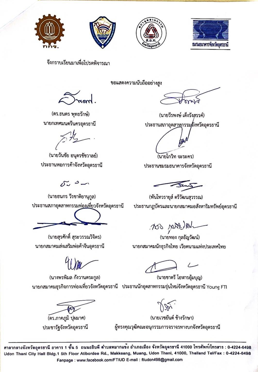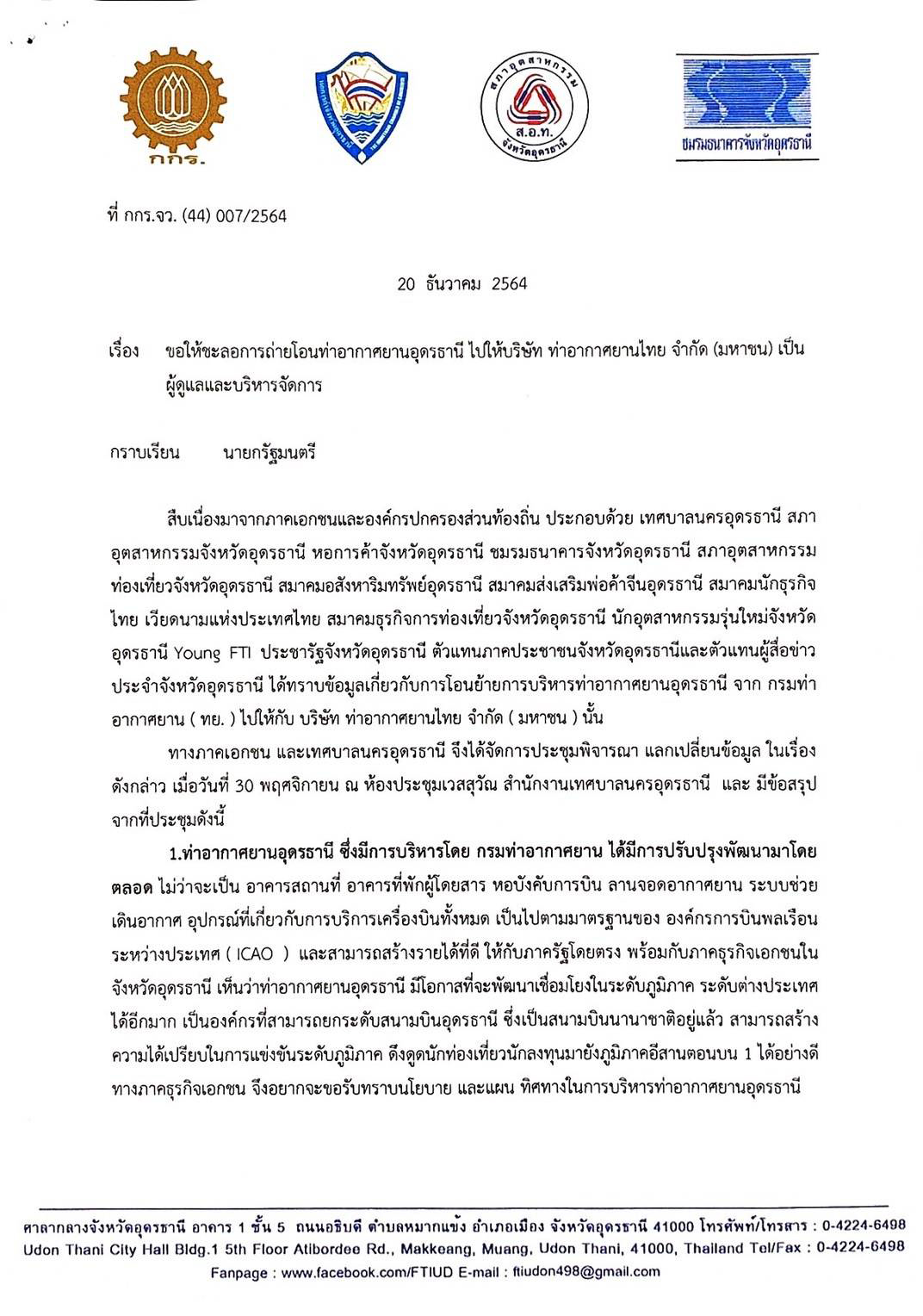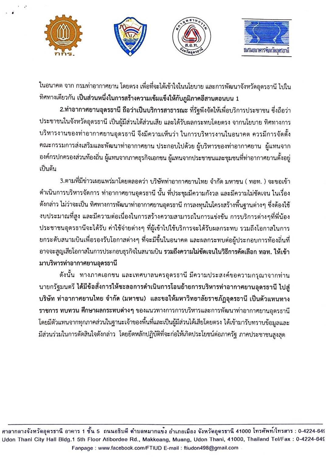 “ดังนั้น ทางภาคเอกชน และเทศบาลนครอุดรธานี มีความประสงค์ขอความกรุณาจากท่านนายกรัฐมนตรี ได้มีข้อสั่งการให้ชะลอการดำเนินการโอนย้ายการบริหารทำอากาศยานอุดรธานี ไปสู่ บริษัท ท่าอากาศยานไทย จำกัด (มหาชน) และขอให้มหาวิทยาลัยราชภัฎอุดรธานี เป็นตัวแทนทางราชการ ทบทวน ศึกษาผลกระทบต่างๆ ของแนวทางการบริหารและการพัฒนาท่าอากาศยานอุดรธานี โดยมีตัวแทนจากทุกภาคส่วนในฐานะเจ้าของพื้นที่และเป็นผู้มีส่วนได้เสียโดยตรง ได้เข้ามารับทราบข้อมูลและมีส่วนร่วมในการตัดสินใจดังกล่าว โดยยึดหลักปฏิบัติที่จะก่อให้เกิดประโยชน์ต่อภาครัฐ ภาคประชาชนสูงสุด” หนังสือระบุ