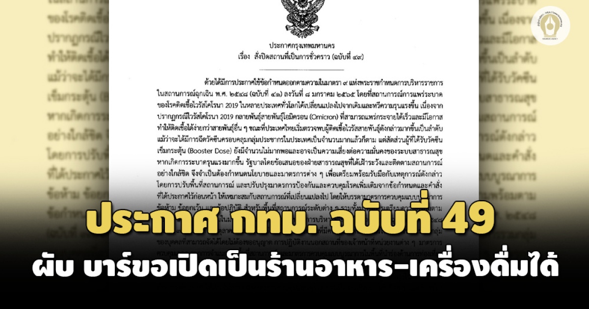กทม.ออกประกาศ ฉบับที่ 49 สถานบันเทิง ผับ บาร์ คาราโอเกะ ที่มีความพร้อมด้านสาธารณสุข ขออนุญาตเปิดเป็นร้านอาหาร-เครื่องดื่มได้ ร้านที่ผ่านมาตรฐาน SHA PLUS หรือ Thai Stop Covid 2 Plus อนุญาตนั่งดื่มแอลกอฮอล์ได้ถึง 3 ทุ่ม