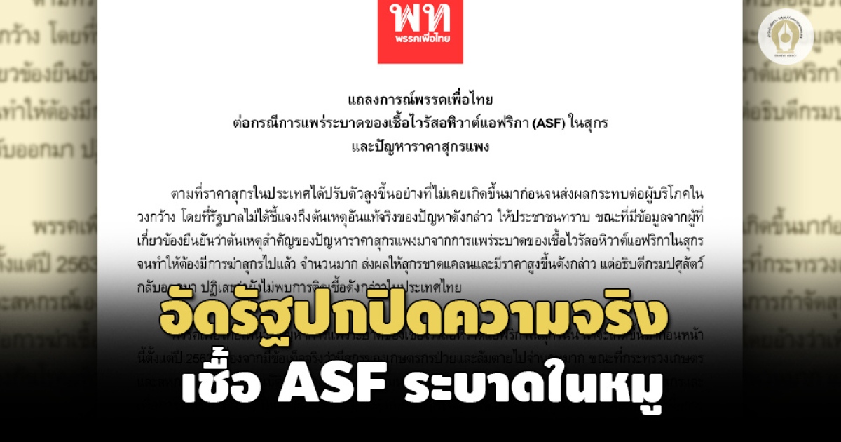 พรรคเพื่อไทยออกแถลงการณ์ อัดรัฐบาลปกปิดข้อเท็จจริงการระบาดเชื้ออหิวาต์แอฟริกาในหมู จี้ควบคุมโรค ASF หามาตรการช่วยเกษตรกร เตรียมอภิปรายในสภาและยื่น ป.ป.ช.ตรวจสอบผู้เกี่ยวข้อง