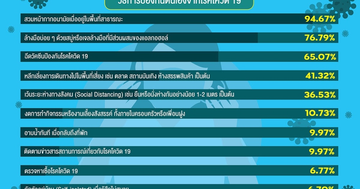 นิด้าโพลเผย ประชาชน ร้อยละ 94.67 ใช้วิธีการป้องกันตนเองจากโรคโควิด 19 ด้วยการสวมหน้ากากอนามัยเมื่ออยู่ในพื้นที่สาธารณะ และ ใช้แอปพลิเคชัน เช่น ไทยชนะ หมอชนะ ร้อยละ 4.11