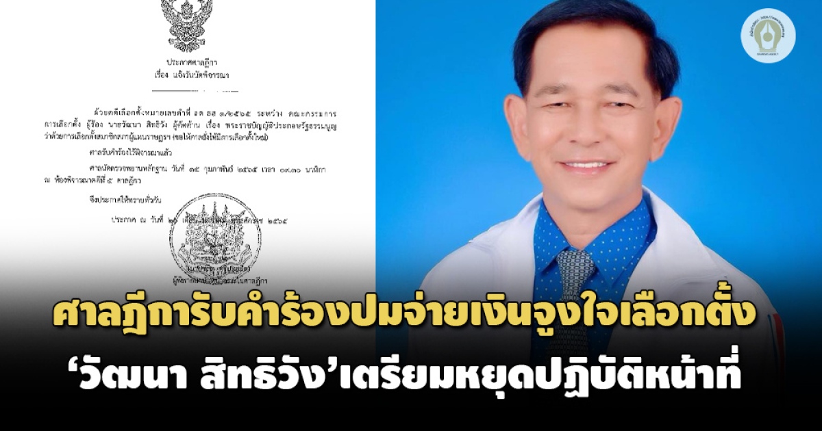 ศาลฎีกา รับคำร้อง กกต. ขอให้ศาลสั่งเลือกตั้ง ส.ส.ลำปาง เขต 4 ใหม่ ปม ‘วัฒนา สิทธิวัง’ 1 ใน 21 ส.ส. 'ก๊วนธรรมนัส' จ่ายเงินจูงใจเลือกตั้ง เตรียมส่งคำสั่งหยุดปฏิบัติหน้าที่ให้รัฐสภา 24 ม.ค.