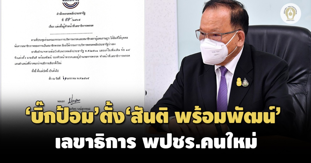 ‘บิ๊กป้อม’ เซ็นคำสั่งตั้ง ‘สันติ พร้อมพัฒน์’ นั่งเลขาฯ พปชร. ให้ทำหน้าที่จนกว่าจะมีการเลือกตั้งใหม่ ส่วนนายทะเบียนพรรค มอบ ‘สุรสิทธิ์’ ทำหน้าที่