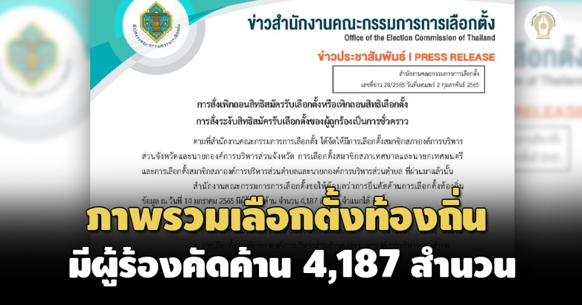 กกต.ขอให้ข้อมูลว่า การยื่นคัดค้านการเลือกตั้งท้องถิ่น ข้อมูล ณ วันที่ 14 ม.ค.2565 มีผู้ร้องคัดค้าน 4,187 สำนวน จำแนก ดังนี้