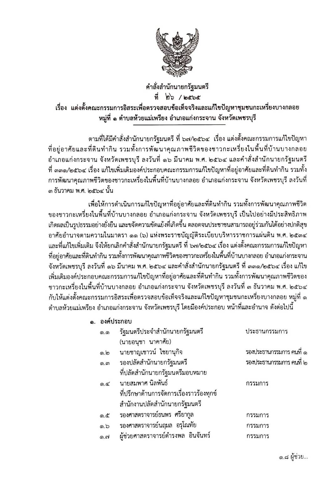 ผู้สื่อข่าวรายงานว่า เมื่อวันที่ 3 ก.พ. 2565 พล.อ.ประยุทธ์ จันทร์โอชา นายกรัฐมนตรี ได้ทำการลงนามในคำสั่งแต่งตั้งคณะกรรมการอิสระเพื่อตรวจสอบข้อเท็จจริงและแก้ไขปัญหาชุมชนกะเหรี่ยงบางกลอย โดยมีรายนาม ดังนี้