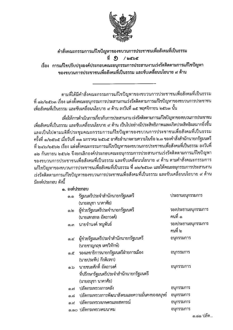 ทั้งนี้ เมื่อวันที่ 2 ก.พ.ที่ผ่านมา พล.อ.ประวิตร วงษ์สุวรรณ รองนายกฯ ในฐานะประธานกรรมการแก้ไขปัญหาของขบวนการประชาชนเพื่อสังคมที่เป็นธรรม (พีมูฟ) ลงนามคำสั่งคณะกรรมการแก้ปัญหาพีมูฟ ที่ 1/2565 เรื่อง การแก้ไขปรับปรุงองค์ประกอบคณะอนุกรรมการประสานงานเร่งรัดติดตามการแก้ไขปัญหาของพีมูฟและขับเคลื่อนนโยบาย 9 ด้าน เพื่อให้การดำเนินการเกี่ยวกับการประสานงานแก้ปัญหาและขับเคลื่อนนโยบายเป็นไปอย่างมีประสิทธิภาพ โดยแต่งตั้งให้ นายอนุชา นาคาศัย รัฐมนตรีประจำสำนักนายกรัฐมนตรี เป็นประธานอนุกรรมการ รองประธานประกอบด้วย นายเสกสกล อัตถาวงษ์ ผู้ช่วยรัฐมนตรีประจำนายกรัฐมนตรี นายจำนงค์ หนูพันธุ์ ประธานพีมูฟ