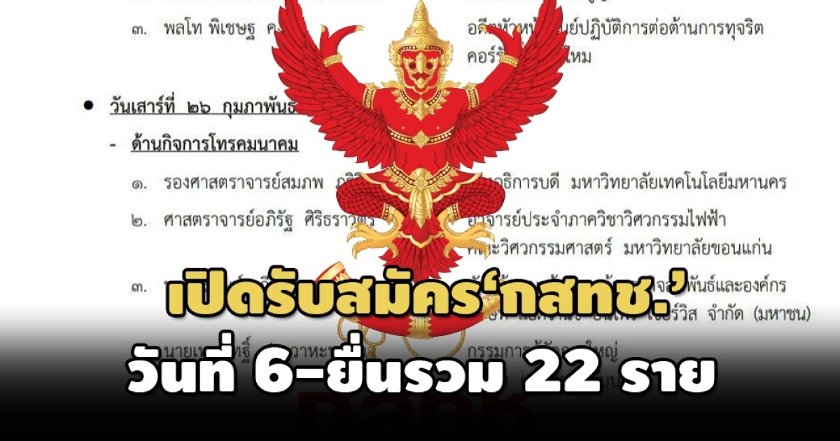 ‘สำนักงานเลขาธิการวุฒิสภา’ เปิดรับสมัคร ‘กรรมการ กสทช.’ วันที่ 6 มีผู้ยื่นใบสมัครรวมแล้ว 22 ราย ‘เจ้ากรมพระธรรมนูญ-ผู้บริหาร AIS’ เข้าร่วมการสรรหาฯ