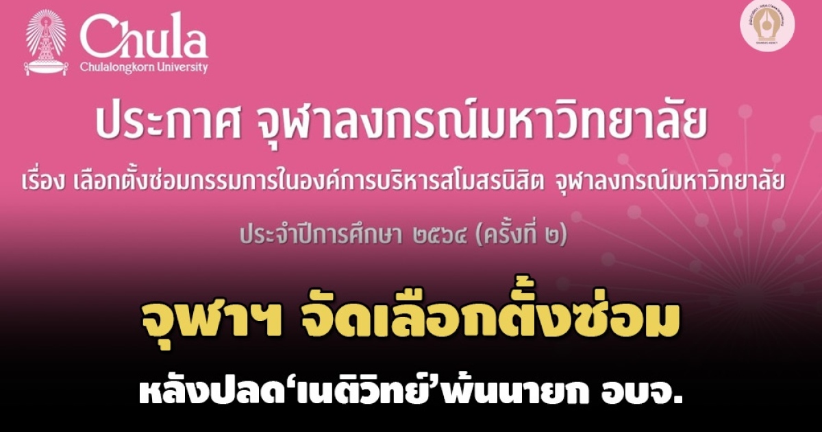 ผู้สื่อข่าวรายงานว่า เมื่อวันที่ 28 ก.พ. 2565 สำนักบริหารกิจการนิสิต จุฬาลงกรณ์มหาวิทยาลัย โพสต์ข้อความผ่านเพจเฟซบุ๊กว่า ประกาศ จุฬาลงกรณ์มหาวิทยาลัย เรื่อง เลือกตั้งซ่อมกรรมการในองค์การบริหารสโมสรนิสิต จุฬาลงกรณ์มหาวิทยาลัย ประจำปีการศึกษา 2565 (ครั้งที่ 2)