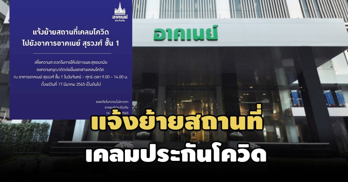 ‘อาคเนย์ฯ-ไทยประกันภัย’ แจ้งลูกค้าย้ายสถานที่เคลมประกันโควิดไปที่ 'อาคารอาคเนย์ ถนนสุรวงศ์' หลัง 'เจ้าหน้าที่สินไหม' สำนักงานใหญ่ ติดโควิด ยืนยันดำเนินการตามปกติ พร้อมประสาน ‘คปภ.’ บริหารสภาพคล่อง