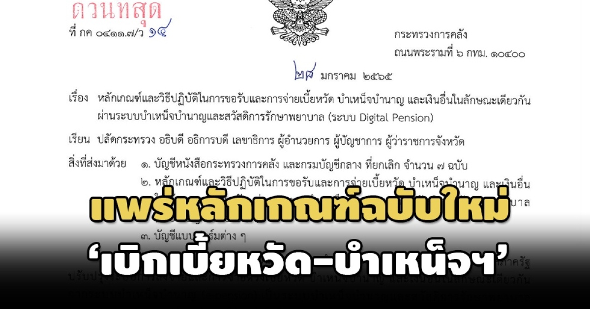 กระทรวงการคลัง จึงยกเลิกหนังสือสั่งการกระทรวงการคลังและกรมบัญชีกลาง จำนวน 7 ฉบับ และกำหนดหลักเกณฑ์และวิธีปฏิบัติในการขอรับและการจ่ายเบี้ยหวัด บำเหน็จบำนาญ และเงินอื่นในลักษณะเดียวกัน ผ่านระบบบำเหน็จบำนาญและสวัสดิการรักษาพยาบาล (ระบบ Digital Pension) รวมทั้งกำหนดแบบฟอร์มต่างๆที่ใช้ในการปฏิบัติงาน เพื่อให้ส่วนราชการทราบและถือปฏิบัติตั้งแต่วันที่ 1 ก.พ.2565 เป็นต้นไป