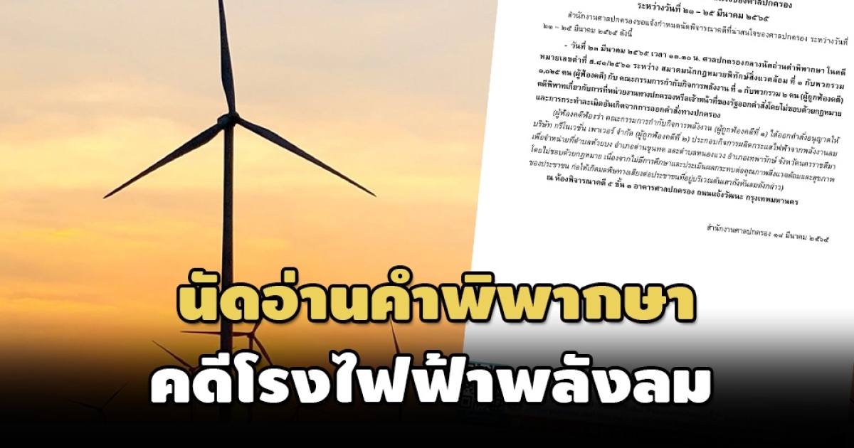 ‘ศาลปกครองกลาง’ นัดอ่านคำพิพากษา คดี ‘สมาคมนักกฎหมายพิทักษ์สิ่งแวดล้อม-พวก’ ฟ้อง ‘กกพ.’ กรณีมีคำสั่งอนุญาต ‘กรีโนเวชั่น เพาเวอร์’ ประกอบกิจการผลิตกระแสไฟฟ้าพลังงานลม 'สราญลมวินด์ฟาร์ม' โดยไม่ชอบด้วยกฎหมาย