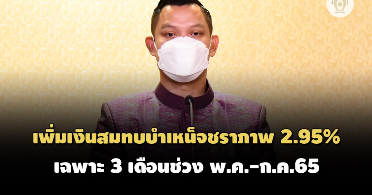 ครม.เคาะอัตราจ่ายเงินบำเหน็จชราภาพเพิ่มให้แก่ผู้ประกันตน 2.95% รวม 3 เดือน ผู้ประกันตน 4.8 ล้านคนได้เงินเพิ่ม 4,553 ล้านบาท นอกจากนั้นยังลดอัตราเงินสมทบ 3 เดือนช่วง พ.ค.-ก.ค.2565