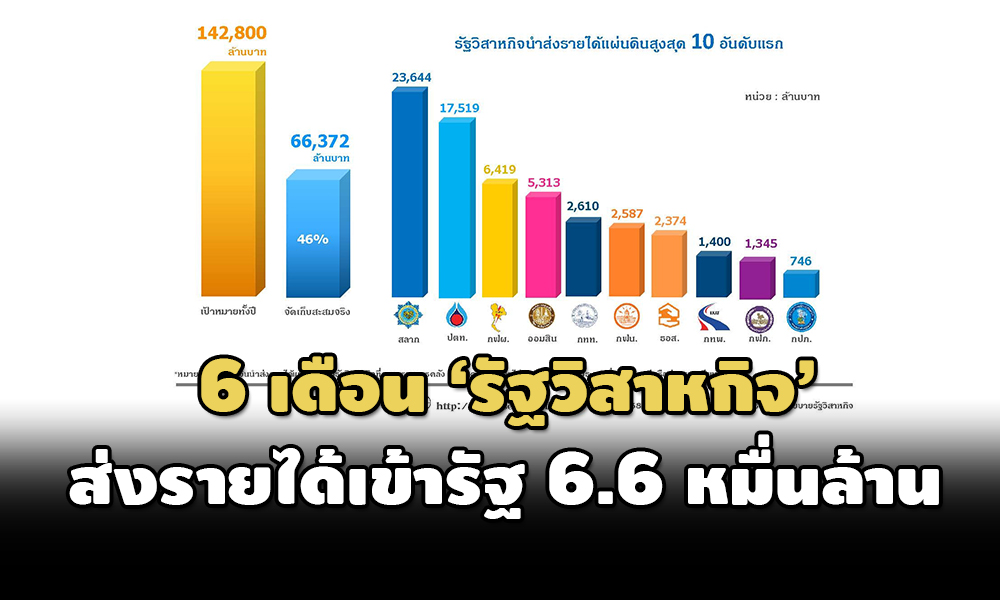 ‘สคร.’ เผย 6 เดือนของปีงบ 65 รัฐวิสาหกิจนำส่งรายรายได้เข้ารัฐแล้ว 6.63 หมื่นล้านบาท สูงกว่าประมาณการ 8.5 พันล้าน 'สนง.สลากกินแบ่งฯ' ส่งรายได้มากสุด 2.36 หมื่นล้าน