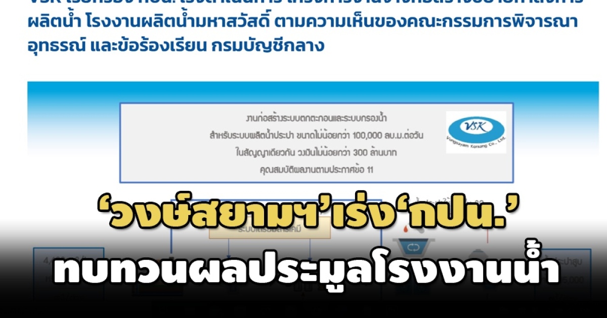 โดยระบุว่า จากกรณีที่ บริษัท วงษ์สยามก่อสร้าง จำกัด (VSK) ผู้ยื่นเสนอราคาต่ำสุด เป็นเงิน 6,150,000,000.00 บาท (รวมภาษีมูลค่าเพิ่ม) ซึ่งต่ำกว่าราคากลางเป็นเงินจำนวน 376,973,718.58 บาท (รวมภาษีมูลค่าเพิ่ม) ซึ่ง ITA Consortium ผู้ได้รับการพิจารณาจาก กปน. ให้เป็นผู้ชนะ การประกวดราคาเสนอราคาเป็นเงินจำนวน 6,460,560,000.00 บาท (รวมภาษีมูลค่าเพิ่ม) สูงกว่า ราคาที่บริษัท VSK เสนอเป็นเงินจำนวน 310,560,000.00 บาท