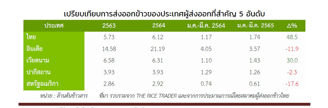สมาคมผู้ออกข้าวไทย ยังระบุว่า ในช่วง 3 เดือนแรกของปีนี้ (ม.ค.-มี.ค.2565) ไทยส่งออกข้าวได้เป็นอันดับ 2 ของโลกที่ปริมาณ 1.74 ล้านตัน เพิ่มขึ้น 48.5% เมื่อเทียบกับช่วงเดียวกันของปีก่อน โดยประเทศที่ส่งออกข้าวอันดับ 1 ยังคงเป็นอินเดีย ที่ส่งออกข้าวได้ 3.57 ล้านตัน ลดลง 11.9% ส่วนผู้ส่งออกข้าวอันดับ 3 ได้แก่ เวียดนาม ส่งออกข้าวได้ 1.43 ล้านตัน เพิ่มขึ้น 30% อันดับ 4 ปากีสถาน ส่งออกข้าวได้ 1.26 ล้านตัน ลดลง 2.3% และอันดับ 5 สหรัฐฯ ส่งออกข้าวได้ 0.61 ล้านตัน ลดลง 17.6%