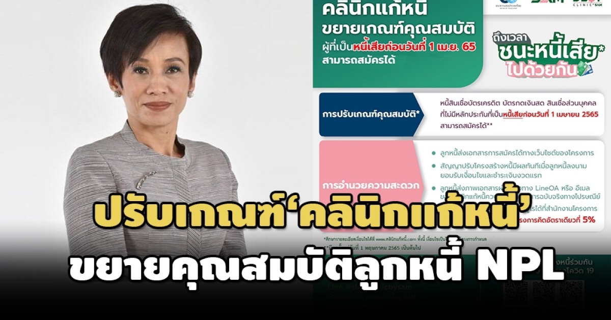 ‘กคน.’ ปรับเกณฑ์คุณสมบัติลูกหนี้ที่สมัครเข้าร่วมโครงการฯ ‘คลินิกแก้หนี้’ ให้ครอบคลุมลูกหนี้ที่มีสถานะเป็น NPL ก่อนวันที่ 1 เม.ย.2565