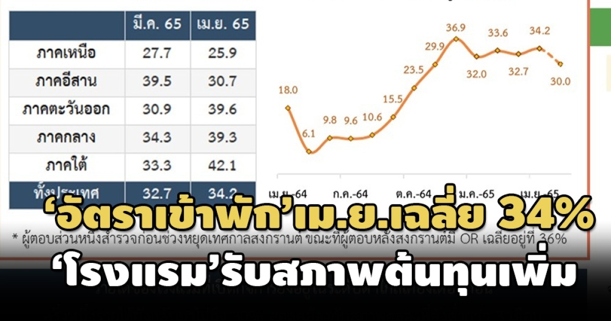 ทั้งนี้ การเพิ่มขึ้นของอัตราการเข้าพักในเดือน เม.ย.2565 ดังกล่าว มาจากการเดินทางท่องเที่ยวของชาวไทยในช่วงวันหยุดสงกรานต์ มาตรการกระตุ้นการท่องเที่ยวของภาครัฐ และการผ่อนคลายการเดินทางเข้าประเทศ อย่างไรก็ตาม การฟื้นตัวของธุรกิจที่พักแรมถูกกดดันจากต้นทุนที่สูงขึ้น ขณะที่การปรับขึ้นราคาห้องพักได้ยาก และประชาชนบางส่วนยังลดกิจกรรมท่องเที่ยว