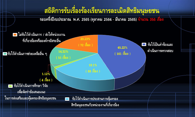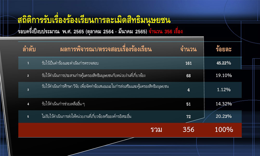 ในรอบครึ่งปีงบประมาณ พ.ศ. 2565 สำนักงาน กสม. ได้รับเรื่องร้องเรียน รวมทั้งสิ้น 356 เรื่อง โดยเรื่องที่รับไว้ดำเนินการ มีจำนวน 284 เรื่อง คิดเป็นร้อยละ 79.77 และเรื่องที่ไม่รับไว้พิจารณา มีจำนวน 72 เรื่อง คิดเป็นร้อยละ 20.23