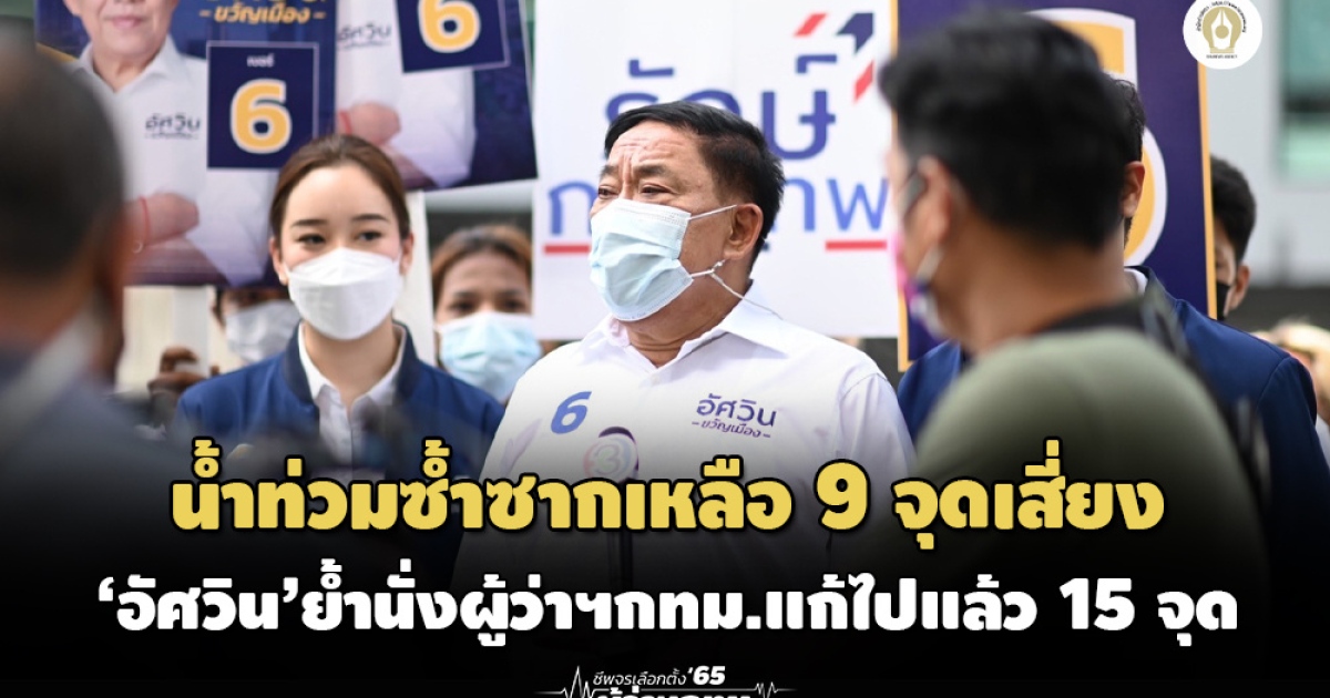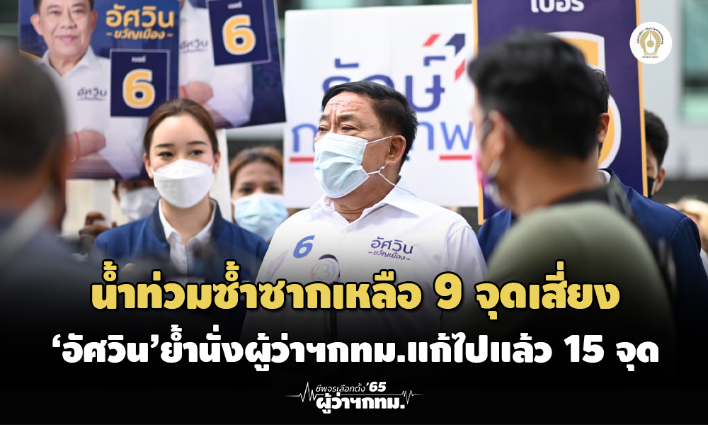 ผู้สื่อข่าวรายงานว่า เมื่อวันที่ 18 พ.ค.2565 พล.ต.อ.อัศวิน ขวัญเมือง ผู้สมัครผู้ว่าราชการกรุงเทพมหานคร ลงพื้นที่หาเสียงช่วงเช้าที่ตลาดเสรี เจริญกรุง 109 บริเวณหลังโรงพยาบาลเจริญกรุงประชารักษ์ พร้อมตอบคำถามการแก้ไขปัญหาน้ำท่วมในช่วงที่เข้าสู่ฤดูฝนว่า ต้องมาแก้ไขต่อให้จบ อย่างที่บอกไปแล้วว่า น้ำท่วมใน กทม.มีจุดน้ำท่วมซ้ำซาก 24 จุด และตอนเป็นผู้ว่าฯ กทม.ก็แก้ไขไปแล้ว 15 จุด ตอนนี้เหลือเพียง 9 จุดเท่านั้น