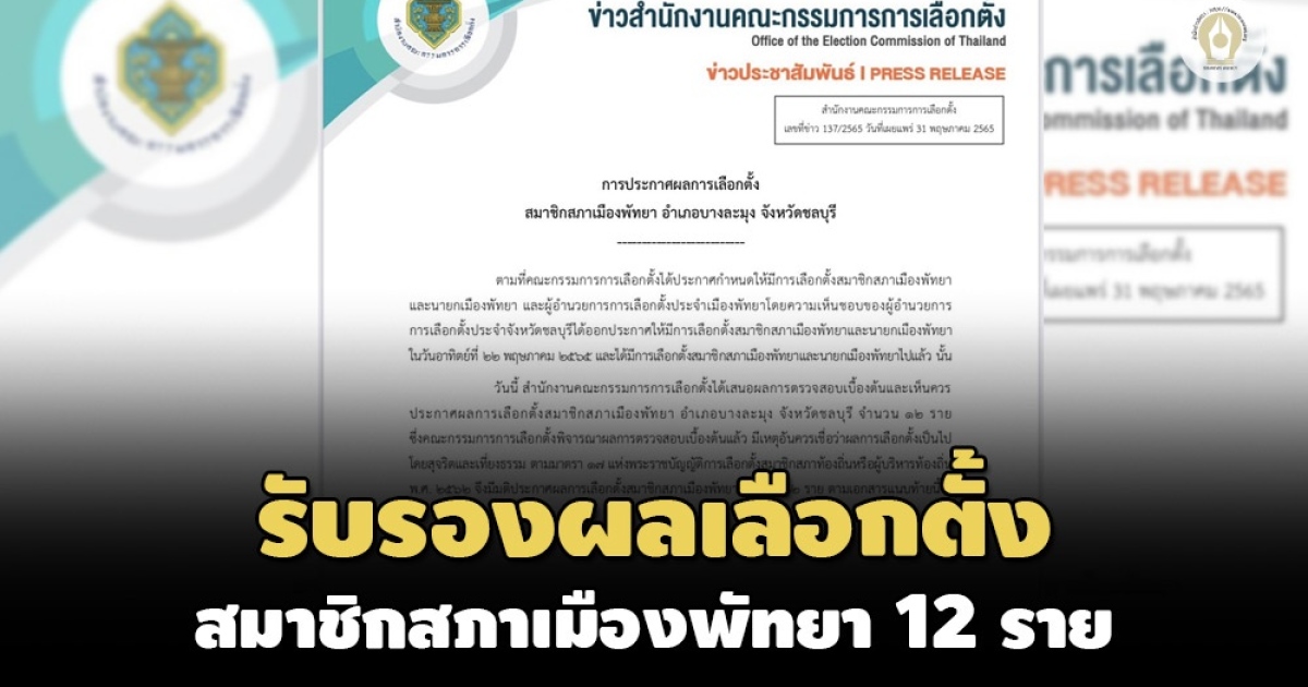 ผู้สื่อข่าวรายงานว่า เมื่อวันที่ 31 พ.ค. 2565 สำนักงานคณะกรรมการเลือกตั้ง (สำนักงาน กกต.) ประกาศรับรองผลการเลือกตั้งสมาชิกสภาเมืองพัทยา (สม.) อ.บางละมุง จ.ชลบุรี 12 ราย