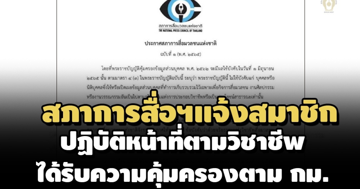 'สภาการสื่อมวลชนแห่งชาติ' ออกแถลงการณ์แจ้งสมาชิกทุกองค์กร ปฏิบัติหน้าที่อยู่ในกรอบข้อบังคับจริยธรรมแห่งวิชาชีพสื่อมวลชน เพื่อจะได้รับความคุ้มครองตาม พ.ร.บ.คุ้มครองข้อมูลส่วนบุคคล พ.ศ.2562