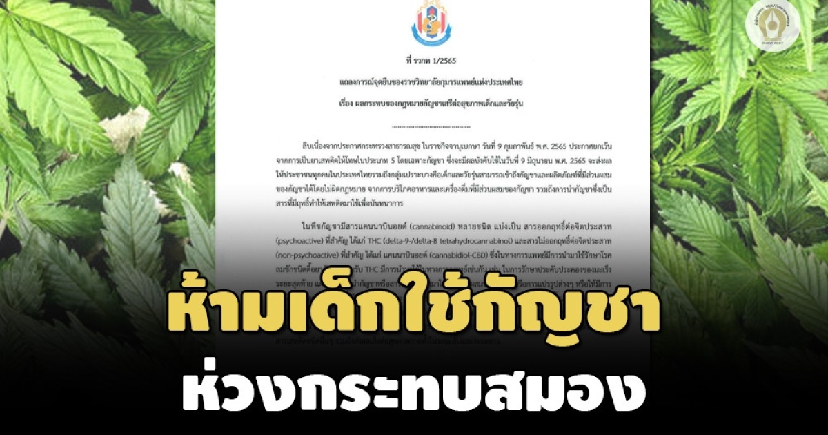 ราชวิทยาลัยกุมารแพทย์ฯ แถลงแสดงจุดยืน ห้ามเด็ก-วัยรุ่นต่ำกว่า 20 ปีใช้กัญชา ห่วงมีผลต่อสมอง ย้ำ ต้องมีเครื่องหมายระบุชัดเจน ควบคุมมาตรฐานการผลิต-ขาย