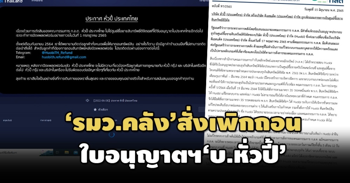 รมว.คลัง มีคำสั่งเพิกถอนใบอนุญาตประกอบธุรกิจศูนย์ซื้อขายสินทรัพย์ดิจิทัลของ ‘บ.หั่วปี้ (ประเทศไทย)’ แล้ว หลังไม่สามารถแก้ปัญหา ‘ระบบงาน-บุคลากร’ ให้มีความพร้อมได้ มีผลตั้งแต่ 17 พ.ค.65