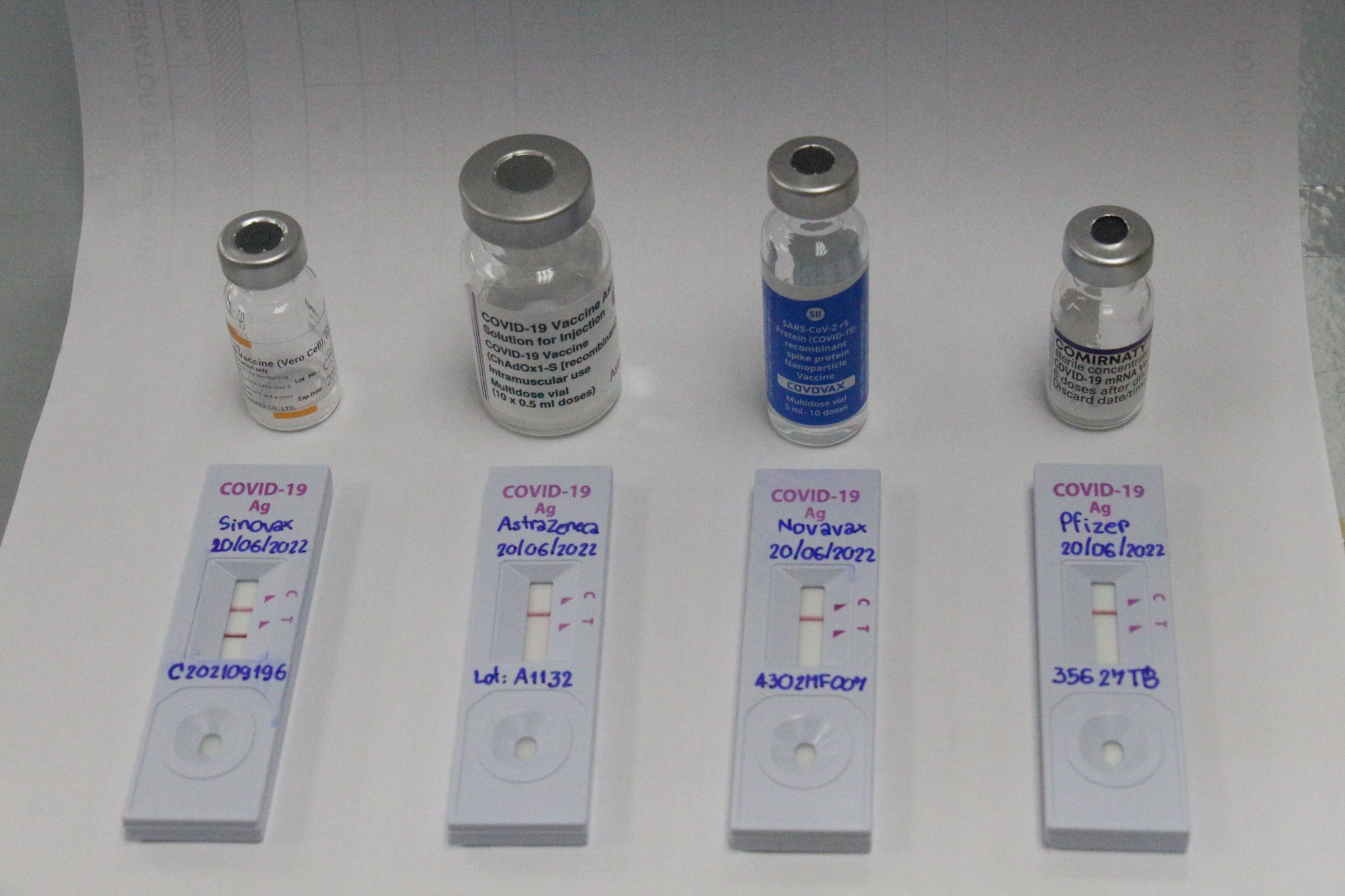 ATK เกือบทั้งหมด ใช้ nucleocapsid โปรตีน ดังนั้นถ้าเอาวัคซีนเชื้อตาย Sinovac มาหยอดใส่ ATK จะได้ผลบวก ( 2 ขีด) ส่วนวัคซีนอื่น แม้กระทั่ง Covovax (Novavax) จะให้ผลลบ เพราะเป็นโปรตีนส่วนสไปรท์