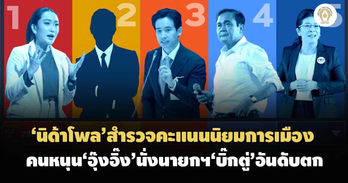 ‘นิด้าโพล’ สำรวจความนิยมทางการเมือง ครั้งที่ 2/2565 ‘อุ๊งอิ๊ง’ คะแนนนิยมพุ่งอันดับหนึ่ง ตัวเต็งนั่งนายกรัฐมนตรี หวังเปิดโอกาสให้คนรุ่นใหม่ ชื่นชอบพรรคเพื่อไทย ผลงานในอดีตของ ‘ทักษิณ’ ขณะที่ ‘พิธา’ อันดับสาม ‘ประยุทธ์’ อยู่ที่สี่ แต่มีสัดส่วนคะแนนลดลง