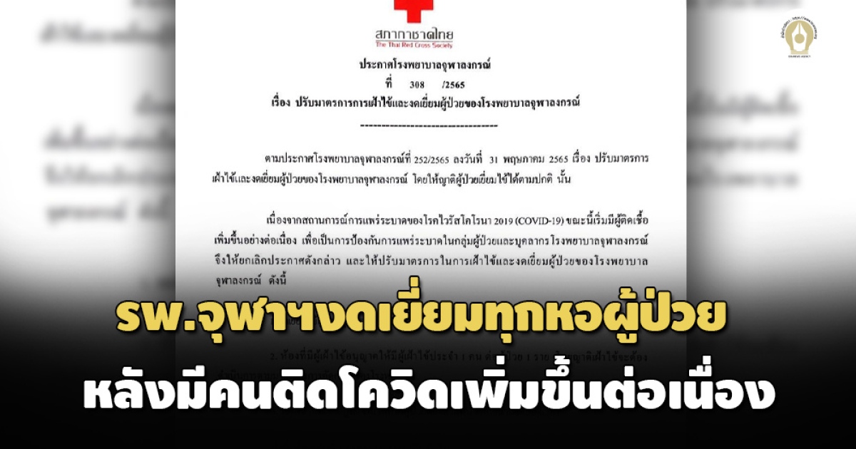 รพ.จุฬาฯ ปรับมาตรการรับมือโควิด หลังมีผู้ป่วยเพิ่มขึ้นต่อเนื่อง แจ้งงดเยี่ยมทุกหอผู้ป่วย อนุญาตให้เฝ้าไข้ประจำ 1 คน เจ้าหน้าที่ต้องสวมหน้ากากอนามัยตลอดเวลา