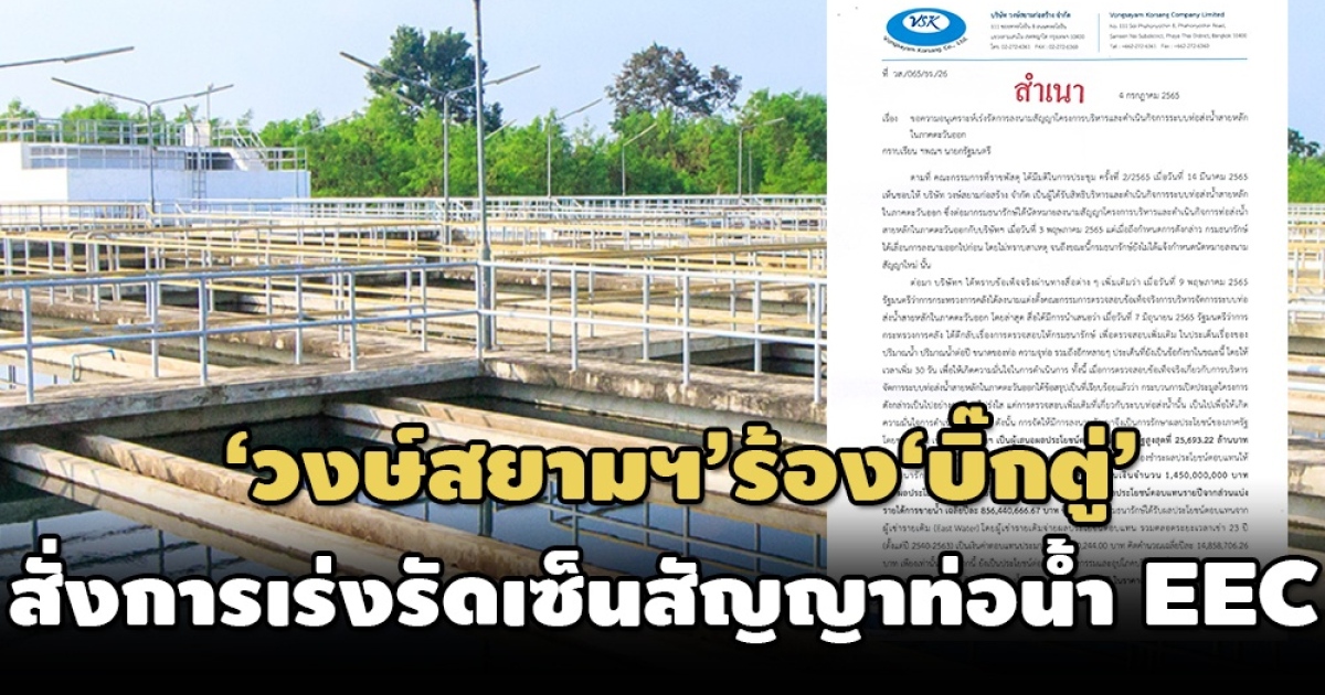 โปรดพิจารณาสั่งการ เพื่อดำเนินการเร่งรัดลงนามสัญญาโครงการบริหารและดำเนินกิจการท่อส่งน้ำสายหลักในภาคตะวันออกเพื่อให้เกิดประโยชน์สูงสุดต่อหน่วยงานภาครัฐต่อไป” หนังสือของ บริษัท วงษ์สยามก่อสร้าง จำกัด เรื่อง ขอความอนุเคราะห์เร่งรัดการลงนามสัญญาโครงการบริหารและดำเนินกิจการระบบท่อส่งน้ำสายหลักในภาคตะวันออก ลงวันที่ 4 ก.ค.2565 ระบุ