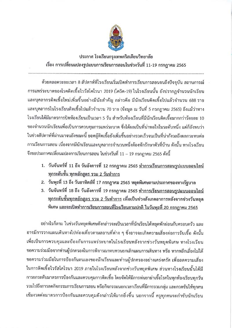 วันจันทร์ที่ 11 ถึง วันอังคารที่ 12 กรกฎาคม 2565 ทำการเรียนการสอนรูปแบบออนไลน์ ทุกระดับชั้น ทุกหลักสูตร รวม 2 วันทำการ