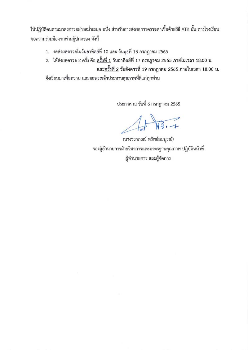 วันจันทร์ที่ 18 ถึง วันอังคารที่ 19 กรกฎาคม 2565 ทำการเรียนการสอนรูปแบบออนไลน์ ทุกระดับชั้นทุกหลักสูตร รวม 2 วันทำการ เพื่อเป็นช่วงสังเกตอาการหลังจากช่วงวันหยุด พิเศษ และจะเปิดทำการเรียนการสอนที่โรงเรียนตามปกติ ในวันพุธที่ 20 กรกฎาคม 2565
