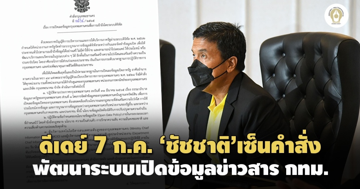 ‘ชัชชาติ’เซ็นคำสั่ง กทม. เปิดเผยข้อมูลขึ้นระบบดิจิทัล มีผลเมื่อ 7 ก.ค.ที่ผ่านมา วาง 6 แนวทางนำข้อมูลงบประมาณ, การจัดซื้อจัดจ้าง และการจัดเก็บรายได้ พร้อมสั่งให้รายงานผลดำเนินการททุกๆ 90 - 180 วัน