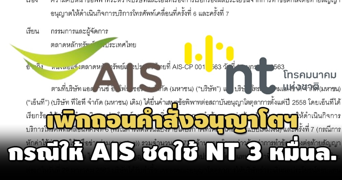สำนักข่าวอิศรา (www.isranews.org) รายงานว่า เมื่อวันที่ 26 ก.ค.ที่ผ่านมา บริษัท แอดวานซ์ อินโฟร์ เซอร์วิส จำกัด (มหาชน) (ADVANC) หรือ AIS แจ้งตลาดหลักทรัพย์ฯ เรื่อง ความคืบหน้าข้อพิพาทระหว่างบริษัทและเอ็นทีเรื่องการเรียกร้องผลประโยชน์จากการทำข้อตกลงต่อท้ายสัญญาอนุญาตให้ดำเนินกิจการบริการโทรศัพท์เคลื่อนที่ครั้งที่ 6 และครั้งที่ 7 โดยระบุว่า