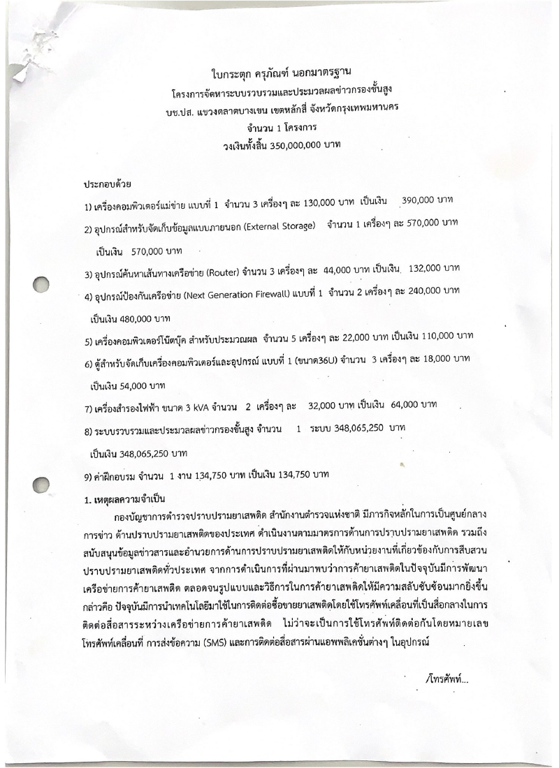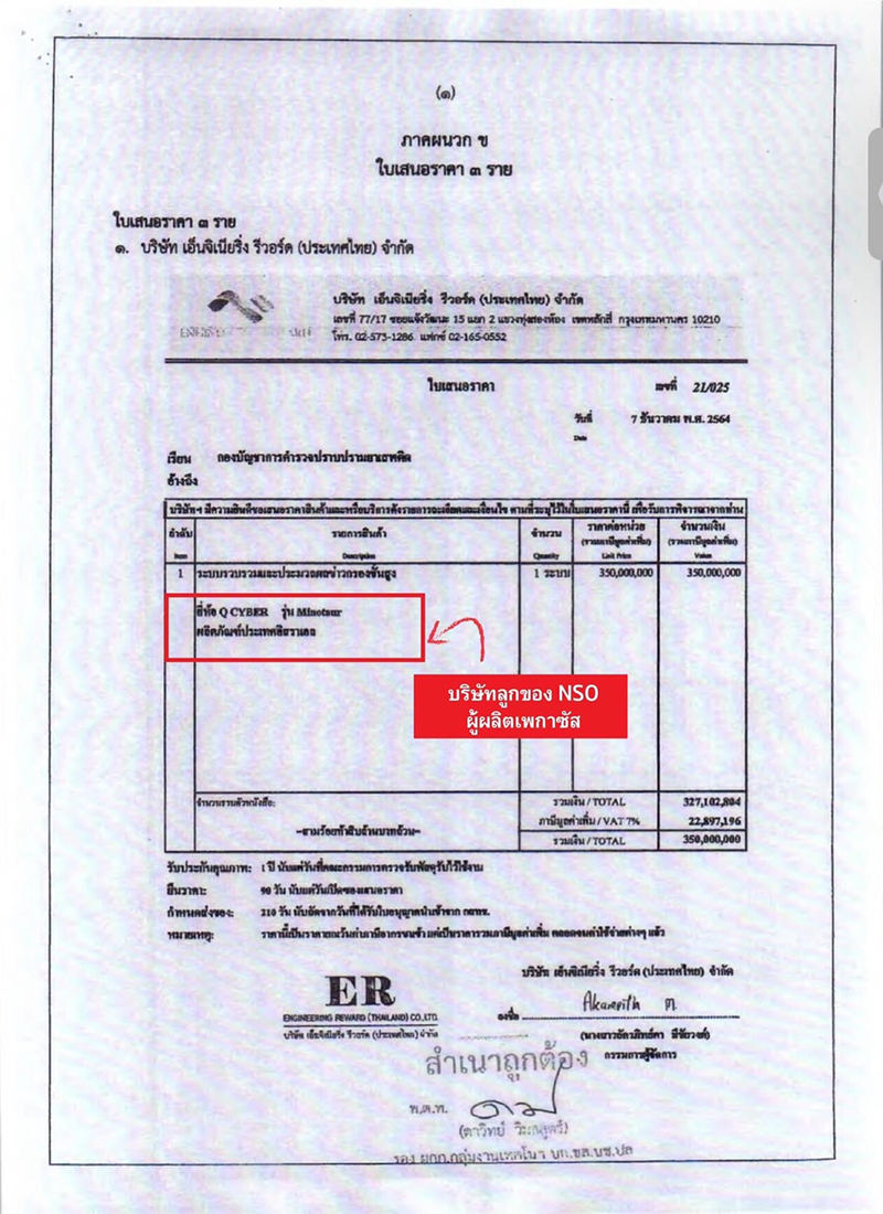 โดยรายที่เสนอราคาต่ำที่สุด คือ บจ.เอ็นจิเนียริ่ง รีวอร์ด (ประเทศไทย) เสนอ ยี่ห้อ Q Cyber รุ่น Minotaur จากประเทศอิสราเอล ซึ่งเครื่องมือรุ่นนี้มีรายงานว่า Q Cyber เป็นบริษัทในเครือของผู้ผลิตเพกาซัส โดยจะผูกพันงบประมาณ 5 ปี ปีละ 300 ล้านบาท หรือคิดรวมแล้วประมาณ 1,500 ล้านบาท