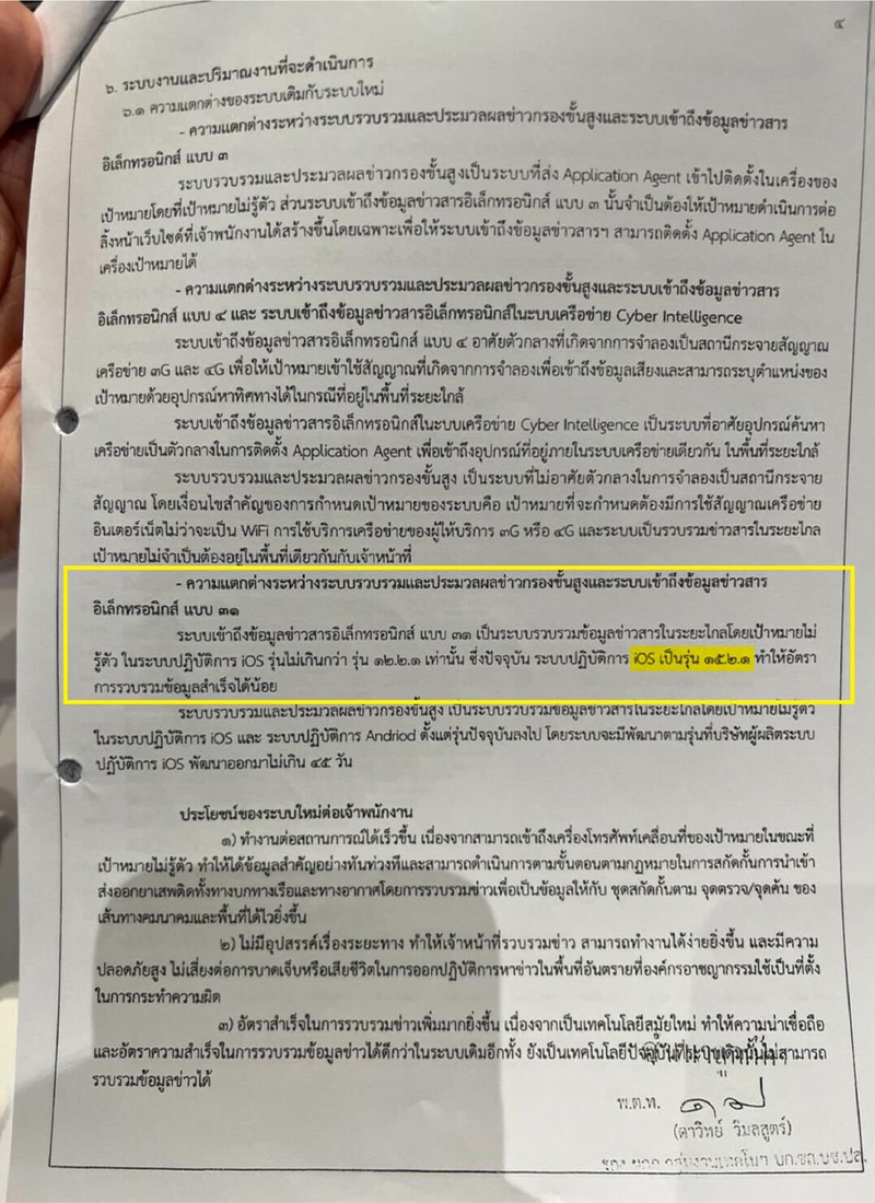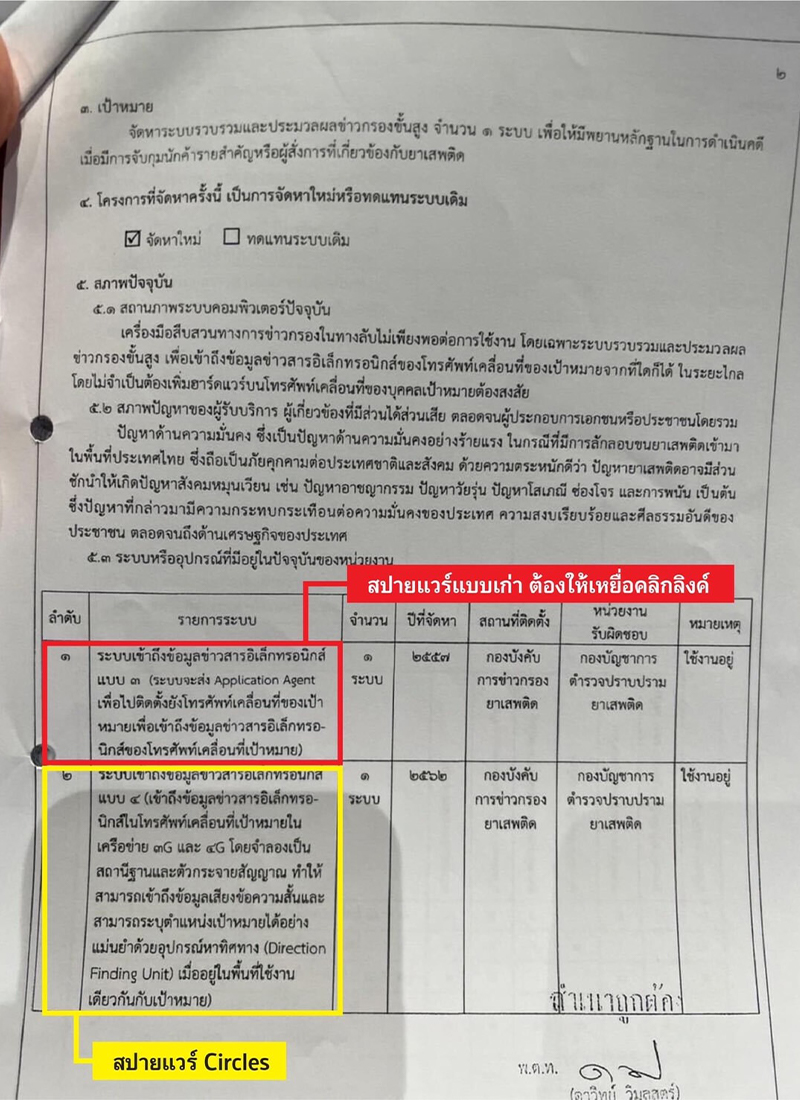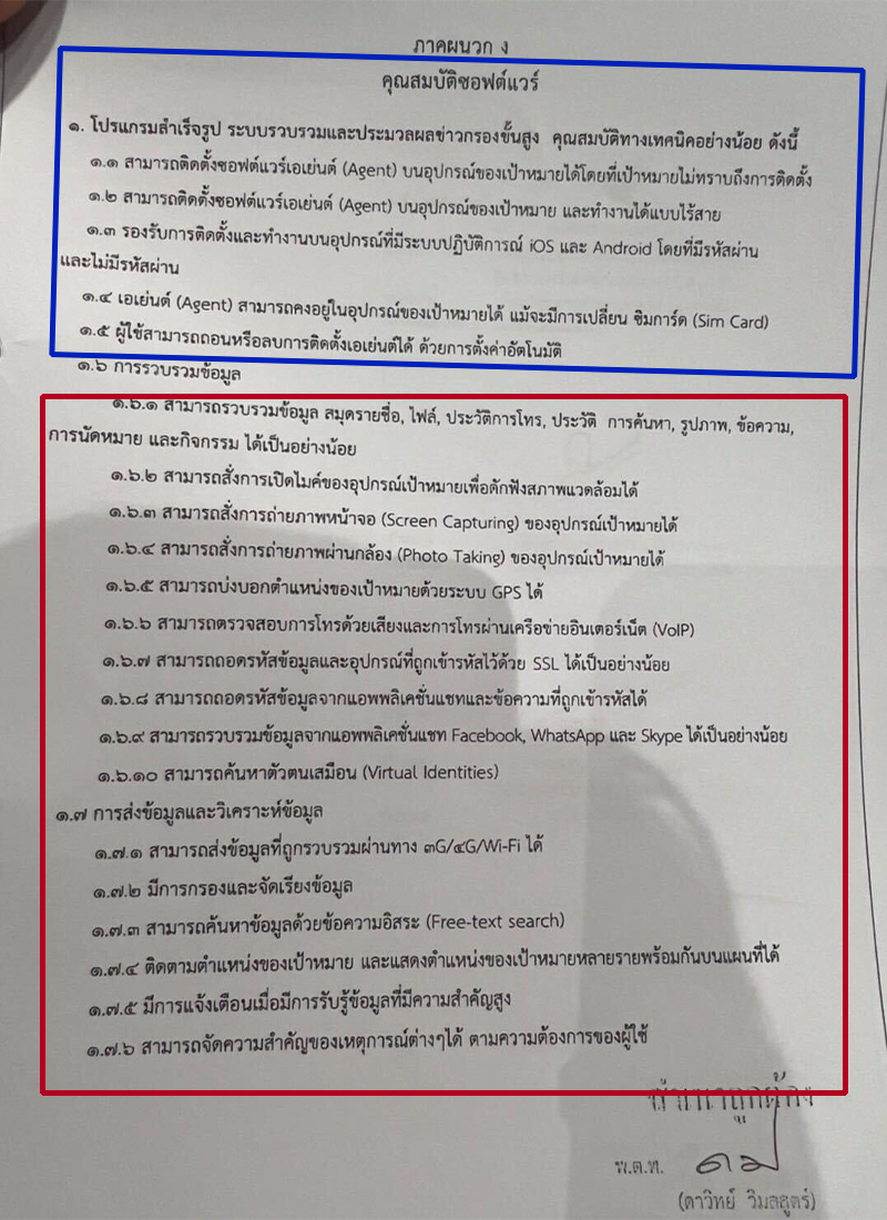 และเมื่อดูภาคผนวก ง. ระบุไว้ชัดว่า คุณสมบัติด้านเทคนิค จะต้องติดตั้งอุปกรณ์ซอฟต์แวร์เอเยนต์ (Software Agent) บนอุปกรณ์ของเป้าหมายได้ โดยที่เป้าหมายไม่รู้ตัว, เอเยนต์สามารถติดตามเป้าหมายได้แม้จะเปลี่ยนเครื่องหรือซิมการ์ด และมีการระบุถึงการวบรวมข้อมูลถึง 10 ข้อ (ดูภาพ)