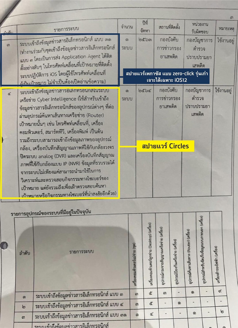ครั้งที่ 3 ปี 2563 จัดซื้อระบบเข้าถึงข้อมูลข่าวสารอิเล็กทรอนิกส์แบบที่ 31 ศักยภาพทำงานร่วมกับระบบเข้าถึงข้อมูลข่าวสารอิเล็กทรอนิกส์แบบที่ 3 เป็นการส่อง Application agent ติดตั้งอย่างลับๆในโทรศัพท์เคลื่อนที่เป้าหมายที่ติดตั้งระบบปฏิบัติการ iOS โดยที่ผู้ใช้โทรศัพท์ไม่จำเป็นต้องเปิดอ่านข้อความ (สปายแวร์เพกาซัส รุ่น Zero-Click) วงเงิน 98 ล้านบาท