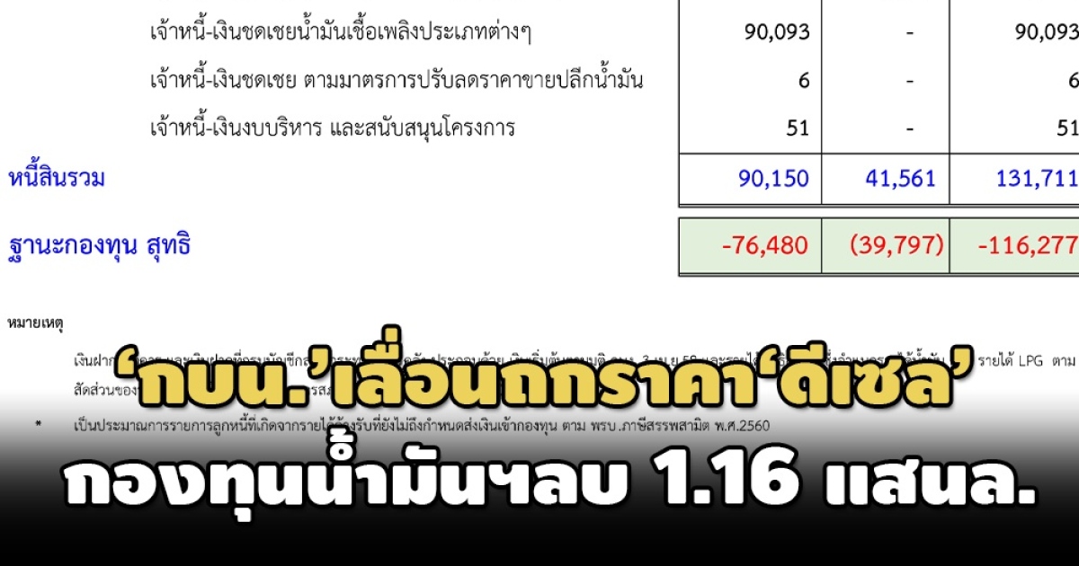 สำหรับประมาณการฐานะกองทุนน้ำมันเชื้อเพลิงปัจจุบัน ล่าสุด ณ วันที่ 31 ก.ค. 2565 พบว่ากองทุนน้ำมันฯติดลบ 116,277 ล้านบาท แบ่งเป็นบัญชีน้ำมันติดลบ 76,480 ล้านบาท และบัญชีก๊าซ LPG ติดลบ 39,797 ล้านบาท