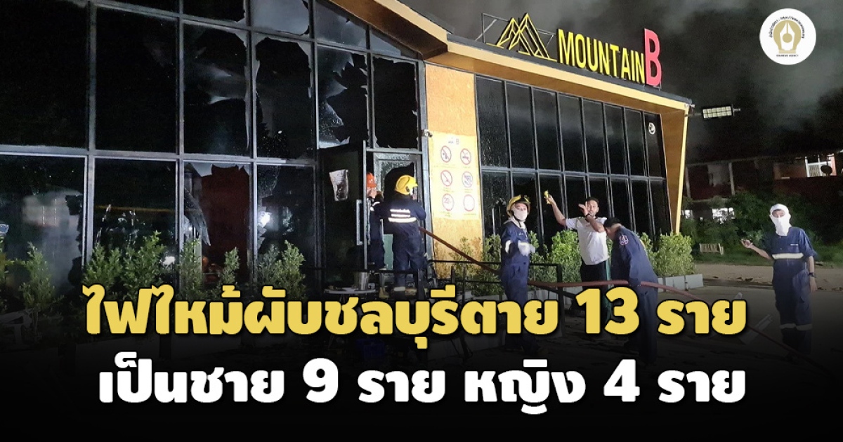 ไฟไหม้ผับ MountainB ผับดัง อ.สัตหีบ จ.ชลบุรี เบื้องต้นมีรายงานผู้เสียชีวิต 13 ราย เป็นชาย 9 ราย หญิง 4 ราย ตำรวจเผยสภาพศพถูกไฟคลอก เห็นใบหน้า-พิสูจน์ตัวตนได้ 11 ราย อยู่ระหว่างรอเคลื่อนย้ายศพมาที่สถาบันนิติเวช รพ.ตำรวจ