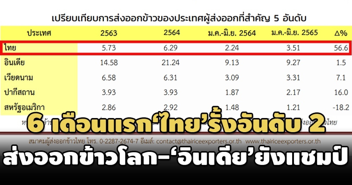 สมาคมผู้ส่งออกข้าวไทย ยังระบุว่า ในช่วง 6 เดือนแรกของปีนี้ (ม.ค.-มิ.ย.2565) ไทยส่งออกข้าวในปริมาณทั้งสิ้น 3.51 ล้านตัน เพิ่มขึ้น 56.6% เมื่อเทียบกับช่วงเดียวกันของปีก่อน และมากที่สุดเป็นอันดับ 2 ของโลก รองจากอินเดียที่มีการส่งออกข้าวในช่วง 6 เดือนแรก คิดเป็นปริมาณ 9.27 ล้านตัน เพิ่มขึ้น 1.5% เมื่อเทียบกับช่วงเดียวกันของปีก่อน ขณะที่ผู้ส่งออกข้าวอันดับ 3 ของโลก คือ เวียดนาม ส่งออกข้าวได้ 3.31 ล้านตัน เพิ่มขึ้น 7.1% อันดับ 4 คือ ปากีสถาน ส่งออกข้าวได้ 2.17 ล้านตัน เพิ่มขึ้น 16% และสหรัฐ ส่งออกข้าวได้ 1.21 ล้านตัน ลดลง 18.2%