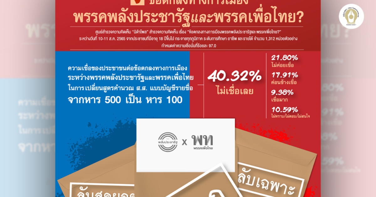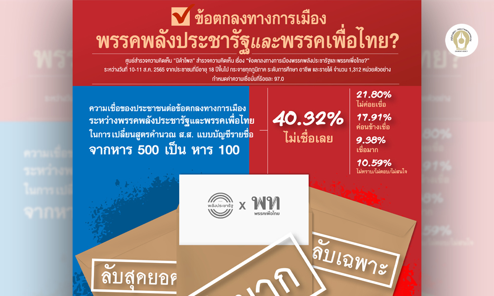 ผู้สื่อข่าวรายงานว่า เมื่อวันที่ 14 ส.ค.2565 ศูนย์สำรวจความคิดเห็นนิด้าโพล สถาบันบัณฑิตพัฒนบริหารศาสตร์ (นิด้า) เผยผลสำรวจของประชาชน เรื่อง ข้อตกลงทางการเมืองพรรคพลังประชารัฐและพรรคเพื่อไทย ? ทำการสำรวจระหว่างวันที่ 10-11 ส.ค.2565 จากประชาชนที่มีอายุ 18 ปีขึ้นไป กระจายทุกภูมิภาค ระดับการศึกษา อาชีพ และรายได้ ทั่วประเทศ รวมทั้งสิ้น จำนวน 1,312 หน่วยตัวอย่าง