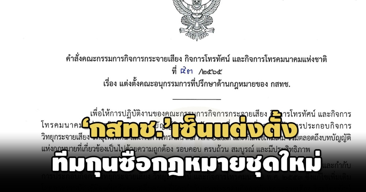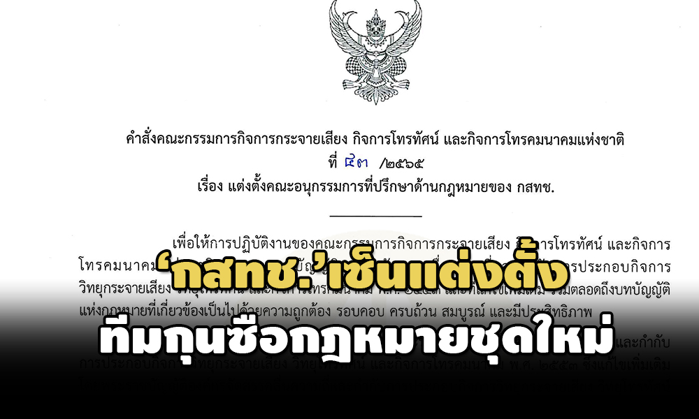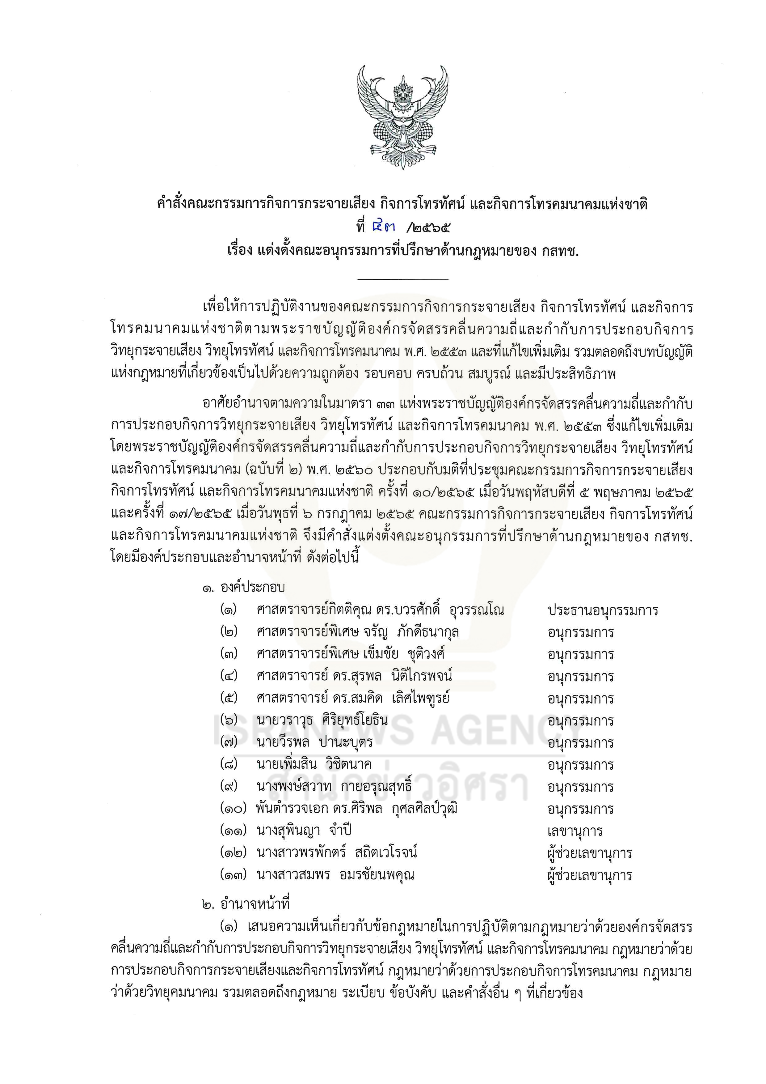 ประกอบกับมติที่ประชุมคณะกรรมการกิจการกระจายเสียงกิจการโทรทัศน์ และกิจการโทรคมนาคมแห่งชาติ ครั้งที่ 10/2565 เมื่อวันพฤหัสบดีที่ 5 พฤษภาคม 2565 และครั้งที่ 17/2565 เมื่อวันพุธที่ 6 กรกฎาคม 2565 คณะกรรมการกิจการกระจายเสียง กิจการโทรทัศน์และกิจการโทรคมนาคมแห่งชาติ จึงมีคำสั่งแต่งตั้งคณะอนุกรรมการที่ปรึกษาด้านกฎหมายของ กสทช. โดยมีองค์ประกอบและอำนาจหน้าที่ ดังต่อไปนี้