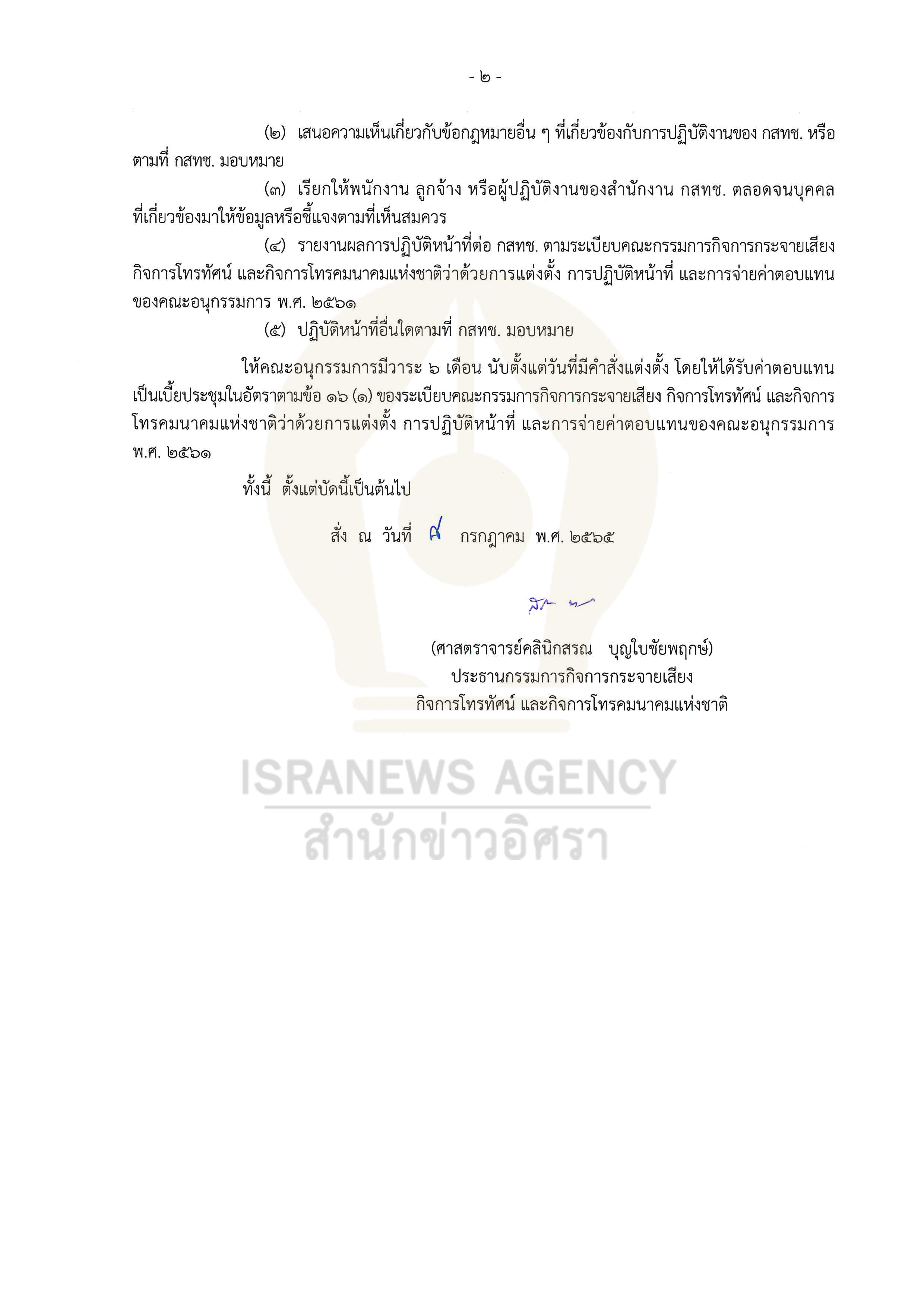 ให้คณะอนุกรรมการมีวาระ 6 เดือน นับตั้งแต่วันที่มีคำสั่งแต่งตั้ง โดยให้ได้รับค่าตอบแทนเป็นเบี้ยประชุมในอัตราตามข้อ 16 (1) ของระเบียบคณะกรรมการกิจการกระจายเสียง กิจการโทรทัศน์ และกิจการโทรคมนาคมแห่งชาติว่าด้วยการแต่งตั้ง การปฏิบัติหน้าที่ และการจ่ายค่าตอบแทนของคณะอนุกรรมการ พ.ศ. 2561