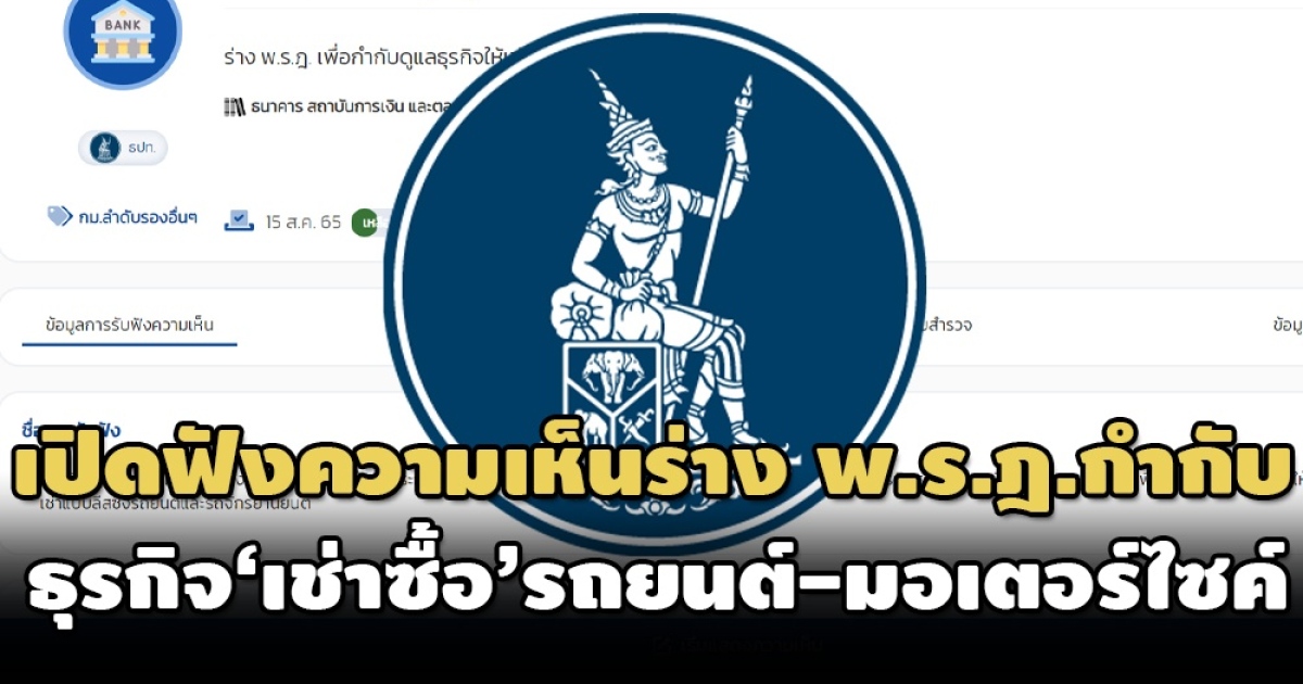 เมื่อวันที่ 15 ส.ค. รายงานข่าวธนาคารแห่งประเทศไทย (ธปท.) แจ้งว่า ธปท. ร่วมกับสำนักงานเศรษฐกิจการคลัง (สศค.) เปิดรับฟังความคิดเห็นและข้อเสนอแนะจากผู้สนใจ ผู้มีส่วนเกี่ยวข้อง และสาธารณชน เพื่อเป็นข้อมูลประกอบการปรับปรุง ร่าง พ.ร.ฎ.กำหนดให้การประกอบธุรกิจทางการเงินบางประเภทอยู่ภายใต้บังคับของพระราชบัญญัติธุรกิจสถาบันการเงิน พ.ศ.2551 พ.ศ. เพื่อกำกับดูแลธุรกิจการให้เช่าซื้อและการให้เช่าแบบลีสซิ่งรถยนต์และรถจักรยานยนต์ ผ่านเว็บไซต์ www.bot.or.th และระบบกลางทางกฎหมาย www.law.go.th ตั้งแต่วันที่ 15-31 ส.ค.2565