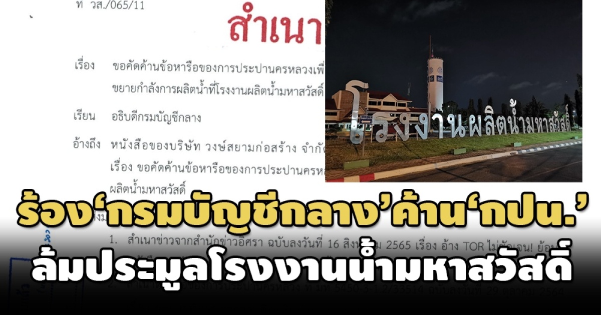 ‘วงษ์สยามก่อสร้าง’ ร่อนหนังสือถึง ‘อธิบดีกรมบัญชี’ คัดค้านกรณี ‘กปน.’ ขอหารือแนวทางล้มประมูลงานขยายโรงงานน้ำมหาสวัสดิ์ฯ 6.5 พันล้าน