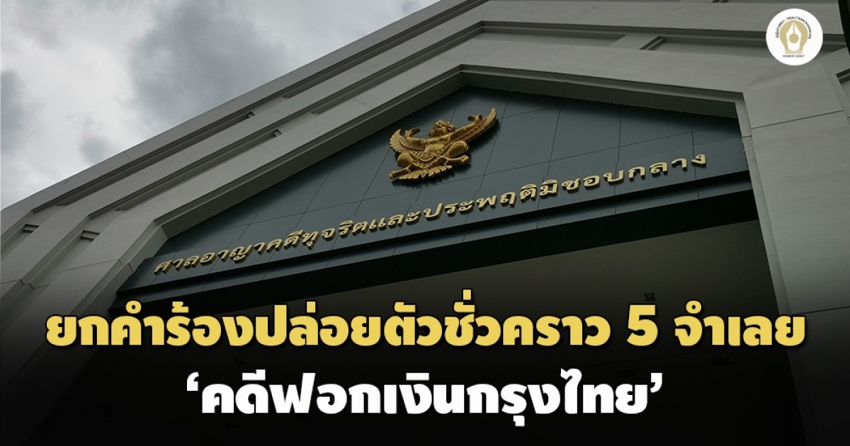 ศาลทุจริตกลาง ยกคำร้องขอประกันตัว 5 จำเลยคดีฟอกเงินกรุงไทย หลังศาลพิพากษาจำคุกคนละ 20 ปี ชดใช้ 8,868 ล้าน
