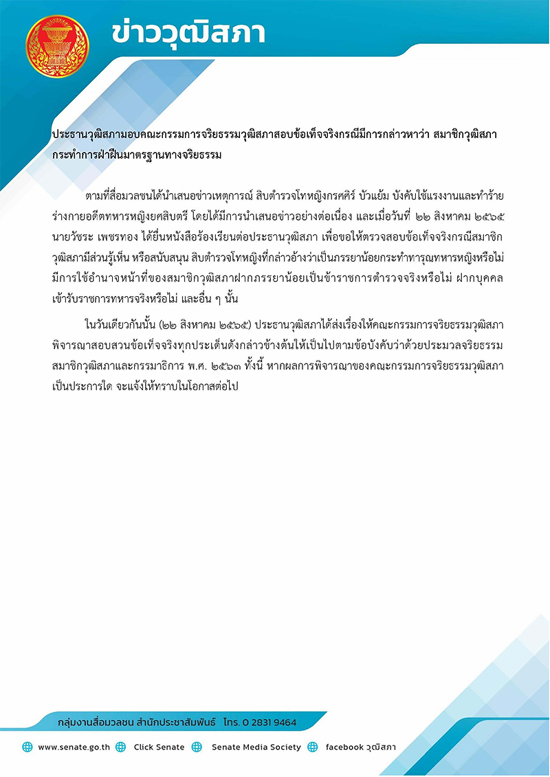 ผู้สื่อข่าวรายงานว่าเพิ่มเติมว่า ก่อนหน้านี้ เมื่อวันที่ 25 ส.ค.2565 สำนักงานเลขาธิการวุฒิสภา เผยแพร่เอกสารข่าว ระบุว่า นายพรเพชร วิชิตชลชัย ประธานวุฒิสภา มอบหมายคณะกรรมการจริยธรรมวุฒิสภา สอบข้อเท็จจริงกรณีมีการกล่าวหาว่า สมาชิกวุฒิสภากระทำการฝ่าฝืนมาตรฐานทางจริยธรรม ตามที่สื่อมวลชนได้นำเสนอข่าวเหตุการณ์ ส.ต.ท.กรศศิร์ ทั้งนี้ได้ส่งเรื่องให้คณะกรรมการจริยธรรมวุฒิสภา พิจารณาสอบสวนข้อเท็จจริงทุกประเด็นดังกล่าวข้างต้นให้เป็นไปตามข้อบังคับว่าด้วยประมวลจริยธรรมสมาชิกวุฒิสภาและกรรมาธิการ พ.ศ. 2563 ทั้งนี้ หากผลการพิจารณาของคณะกรรมการจริยธรรมวุฒิสภาเป็นประการใดจะแจ้งให้ทราบในโอกาสต่อไป
