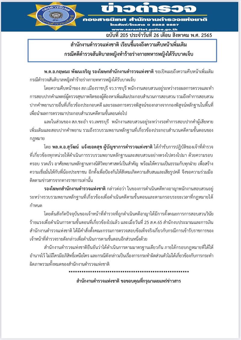 ผู้สื่อข่าวรายงานว่า เมื่อวันที่ 26 ส.ค.2565 พ.ต.อ.กฤษณะ พัฒนเจริญ รองโฆษกสำนักงานตำรวจแห่งชาติ เปิดเผยความคืบหน้า กรณี ส.ต.ท.(หญิง) กรศศิร์ บัวแย้ม ผบ.หมู่ กก.4 บก.1 ผู้ต้องหาทำร้ายร่างกาย อดีตทหารหญิงคนรับใช้อย่างทารุณ ซึ่งถูกศาลจังหวัดราชบุรี และตำรวจคัดค้านการประกันตัว ก่อนนำตัวฝากขัง